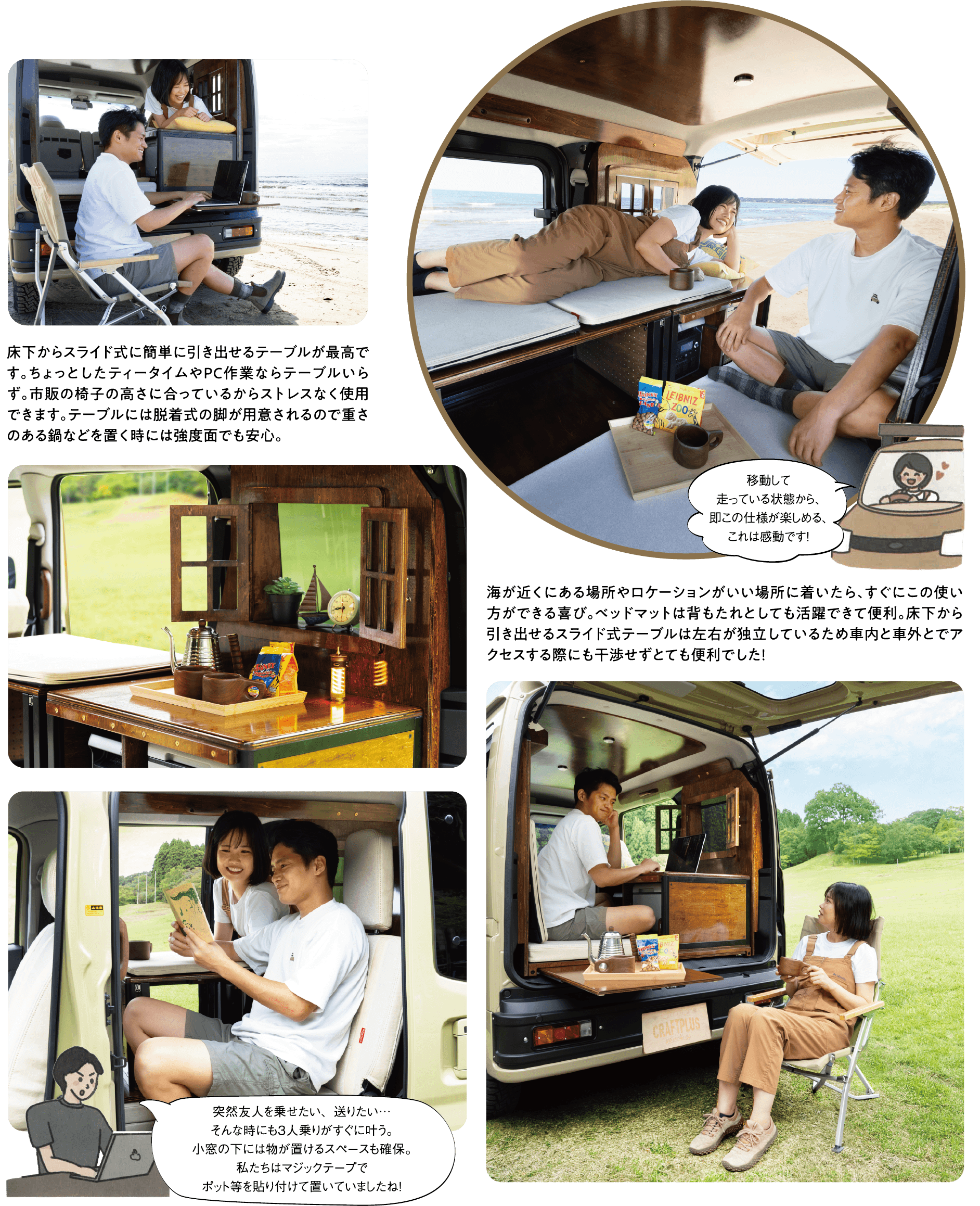 メニュー CAR INTERIOR200系ハイエースセンターコンソールボックスセカンドキャビネットベッドキットS-GLワゴンGLデッキカウンターS-GL標準ボディS-GLワイドボディ/ワゴンGLラゲッジテーブルシフトノブ/アシストグリップカーゴパネル/マットドアパネルダッシュマットランクル70センターコンソールボックスシートカバー内張りベッドキットアシストグリップ78プラドセンターコンソールボックスカーゴパネル内張りシートカバーTOWNACEシートカバーセンターコンソールボックスベッドキットカーゴパネル内張りアシストグリップドリンクホルダーサンバイザーカバーATRAIシートカバーカーゴキットリアゲートパネルアシストグリップコンプリートキットPROBOXシートカバーカーゴパネルサンシェードリアゲートパネルアシストグリップCARAVANシートカバーセンターコンソールボックスセカンドキャビネットベッドキットカーゴパネルアシストグリップNV200ドリンクホルダーJIMNYシートカバーセンターコンソールボックスドリンクホルダーアシストグリップCLIPPERSEAT COVER200系ハイエースS-GLワゴンGL軽自動車2列シート3列シートフロントのみBIKEシートカバー 実績に基づいた知見から 旅に適した軽バンをトータルデザイン。 私たち「軽バン生活」らしさを残しつつ さらにアップデートした室内装備に感動! 9つのパターンから選べる内装デザイン 車体本体価格 (消費税10%込)¥2,950,000~ COMPLETE CAR LINEUP メニュー CAR INTERIOR200系ハイエースセンターコンソールボックスセカンドキャビネットベッドキットS-GLワゴンGLデッキカウンターS-GL標準ボディS-GLワイドボディ/ワゴンGLラゲッジテーブルシフトノブ/アシストグリップカーゴパネル/マットドアパネルダッシュマットランクル70センターコンソールボックスシートカバー内張りベッドキットアシストグリップ78プラドセンターコンソールボックスカーゴパネル内張りシートカバーTOWNACEシートカバーセンターコンソールボックスベッドキットカーゴパネル内張りアシストグリップドリンクホルダーサンバイザーカバーATRAIシートカバーカーゴキットリアゲートパネルアシストグリップコンプリートキットPROBOXシートカバーカーゴパネルサンシェードリアゲートパネルアシストグリップCARAVANシートカバーセンターコンソールボックスセカンドキャビネットベッドキットカーゴパネルアシストグリップNV200ドリンクホルダーJIMNYシートカバーセンターコンソールボックスドリンクホルダーアシストグリップCLIPPERSEAT COVER200系ハイエースS-GLワゴンGL軽自動車2列シート3列シートフロントのみBIKEシートカバー 実績に基づいた知見から 旅に適した軽バンをトータルデザイン。 私たち「軽バン生活」らしさを残しつつ さらにアップデートした室内装備に感動! 9つのパターンから選べる内装デザイン 車体本体価格 (消費税10%込)¥2,950,000~ COMPLETE CAR LINEUP